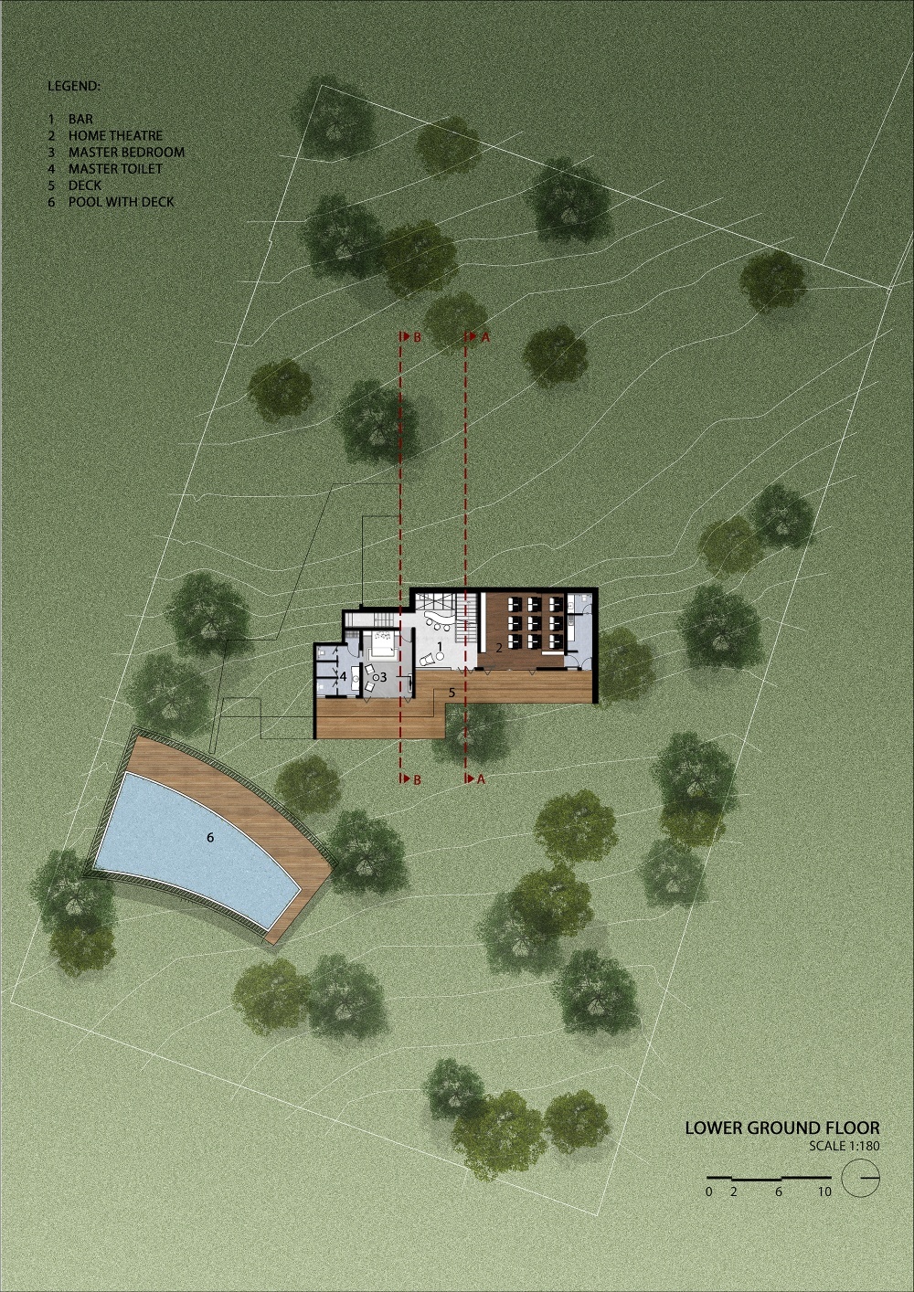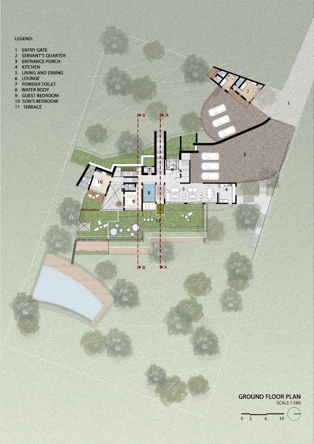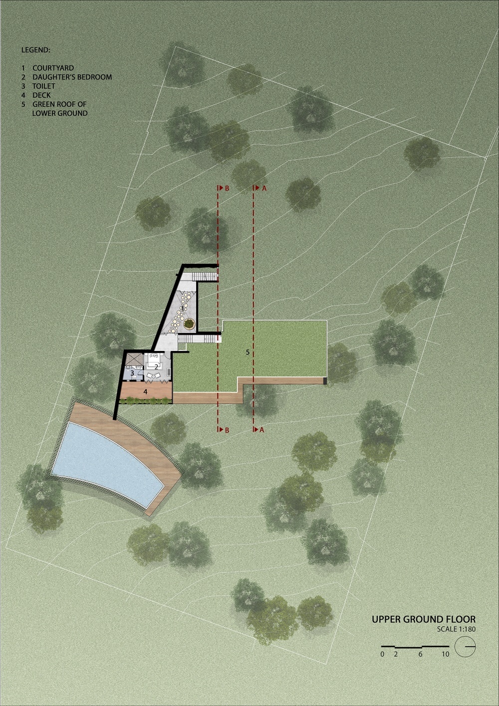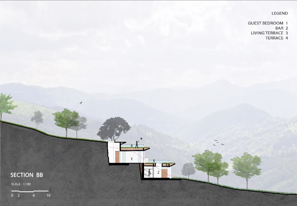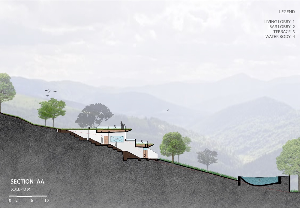 “Earth House” is an attempt to create a built mass in harmony with nature and natural form of the earth. The site is a piece of mountain with steep contour. The house is designed such a way that it sits into the earth without disturbing its natural topography and contours. The earth continues on the terrace in the form of landscape to retain the natural beauty of the mountain. It is designed in such a way, that the spaces cascade down along the contour inside the earth by retaining the shape of the mountain. The spaces designed at various levels are connected through series of courtyards which are dug-out in the earth which also provide natural light and ventilation to the house. This project is a weekend home at Bhugaon, near Pune, for an enthusiastic family of four. The requirement was to have a home which is relaxing and offers various spaces for parties. The house is spread across various levels with multiple courtyards. All the spaces open out on the valley with a step out garden. The planning is done is such a way that house is designed in 3 levels but each level is a ground structure and staggered in a way that it becomes a roof garden for an adjoining floor. A central staircase acts as a spine and connects all the levels. This staircase also creates connection between party lawns at the highest level to the party lawn on the lowest level. This planning allows for flexible movements around the house each time offering new experiences which keeps changing with seasons. The landscape is an integral part of this project. All the spaces including toilets are well connected to the landscape. The house has a rustic tone with natural stone- Shahabad flooring and exposed concrete slabs for ceilings. The furniture in wood complements the raw and natural feel of the space. Ample natural and diffused light through the day allows one to enjoy the landscape view through the day. The creepers coming down from the roofs above create beautiful screening for large openings Overall, this weekend house is in complete harmony with the nature and earth. The architecture completely merges itself with the surroundings adding beauty to the mountain slope. It becomes one with the nature rather than dominating over it.